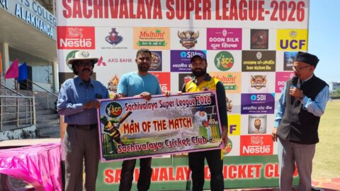 देहरादून | सचिवालय सुपर लीग 2026 में आज दो सेमीफाइनल मुकाबले खेले गए। पहला मैच डेंजर और बुल्स के बीच खेला गया। टॉस जीतकर पहले बल्लेबाजी करते हुए सचिवालय डेंजर ने निर्धारित 20 ओवरों में 136 रन बनाए। वीरेंद्र रावत ने 44 और नूर ने 43 रन बनाए। धरम ने 05 विकेट लिए। लक्ष्य का पीछा करने उतरी बुल्स की टीम ने नरेंद्र के 53 और महेश के 32 रनों की बदौलत 19 वें ओवर में 05 विकेट खोकर लक्ष्य प्राप्त कर लिया। फाजिल ने 03 विकेट लिए। धरम मैन ऑफ द मैच बने। दूसरा मैच पैंथर और सचिवालय…
