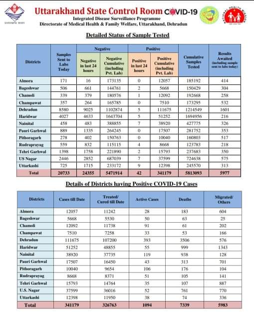 देहरादून | उत्तराखंड में 11 जुलाई 2021 को हेल्थ रिपोर्ट के अनुसार कोरोना मरीजो की संख्या हुई 341179 आज कुल 42 नए मामले मिले, कोरोना संक्रमण से आज प्रदेश में एक मौत हुई है |