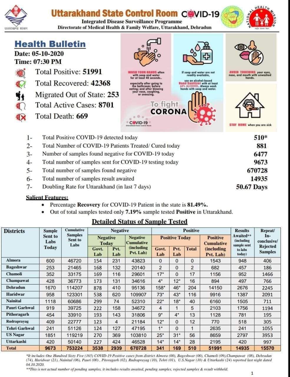 देहरादून | उत्तराखंड में 5 अक्टूबर को हेल्थ रिपोर्ट के अनुसार कोरोना मरीजो की संख्या हुई 51991आज कुल 510 नए मामले मिले , वही 42368 मरीज हुए है ठीक जब कि इस कोरोना संक्रमण से 669 लोगो की मौत भी हुई है | आज अधिक संख्या में देहरादून में 204, हरिद्वार में 116 नैनीताल में 40 , उधमसिंहनगर में 56 उत्तरकाशी में 28 कोरोना के नए मामले मिले है |