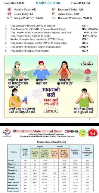 देहरादून| उत्तराखंड में 08 दिसम्बर को हेल्थ रिपोर्ट के अनुसार कोरोना मरीजो की संख्या हुई 79141,आज कुल 632 नए मामले मिले , वही 71541 मरीज हुए है ठीक जब कि इस कोरोना संक्रमण से 1307 लोगो की मौत भी हुई है आज प्रदेश में 12 लोगो की मौत हुई | आज अधिक संख्या में देहरादून में 279, हरिद्वार में 54, नैनीताल में 92 टिहरी में 30, पिथौरागढ़ में 44, अल्मोड़ा में 22, उधमसिंहनगर में 27 कोरोना के नए मामले मिले है |