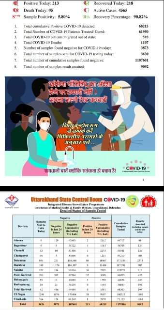 देहरादून | उत्तराखंड में 15 नवम्बर को हेल्थ रिपोर्ट के अनुसार कोरोना मरीजो की संख्या हुई 68215 आज कुल 213 नए मामले मिले , वही 61950 मरीज हुए है ठीक जब कि इस कोरोना संक्रमण से 1107 लोगो की मौत भी हुई है | आज अधिक संख्या में देहरादून में 80, पौड़ी में 35, नैनीताल में 36, उधमसिंहनगर में 38 कोरोना के नए मामले मिले है |