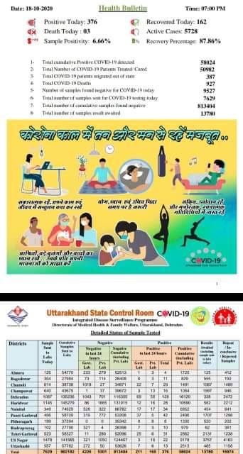 देहरादून | उत्तराखंड में 18 अक्टूबर को हेल्थ रिपोर्ट के अनुसार कोरोना मरीजो की संख्या हुई 58024 आज कुल 376 नए मामले मिले , वही 50982 मरीज हुए है ठीक जब कि इस कोरोना संक्रमण से 376 लोगो की मौत भी हुई है | आज अधिक संख्या में देहरादून में 128 , हरिद्वार में 28 नैनिताल में 34, चमोली में 29, पौड़ी में 42, टिहरी में 31 , उधमसिंहनगर में 22 कोरोना के नए मामले मिले है |