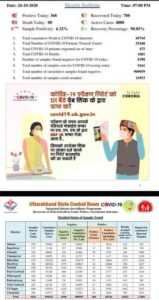 देहरादून | उत्तराखंड में 26 अक्टूबर को हेल्थ रिपोर्ट के अनुसार कोरोना मरीजो की संख्या हुई 60744 आज कुल 368 नए मामले मिले , वही 55188 मरीज हुए है ठीक जब कि इस कोरोना संक्रमण से 1001 लोगो की मौत भी हुई है | आज अधिक संख्या में देहरादून में 97, हरिद्वार में 42, नैनिताल में 45, चमोली में 20, टिहरी में 47, उधमसिंहनगर में 22 कोरोना के नए मामले मिले है |