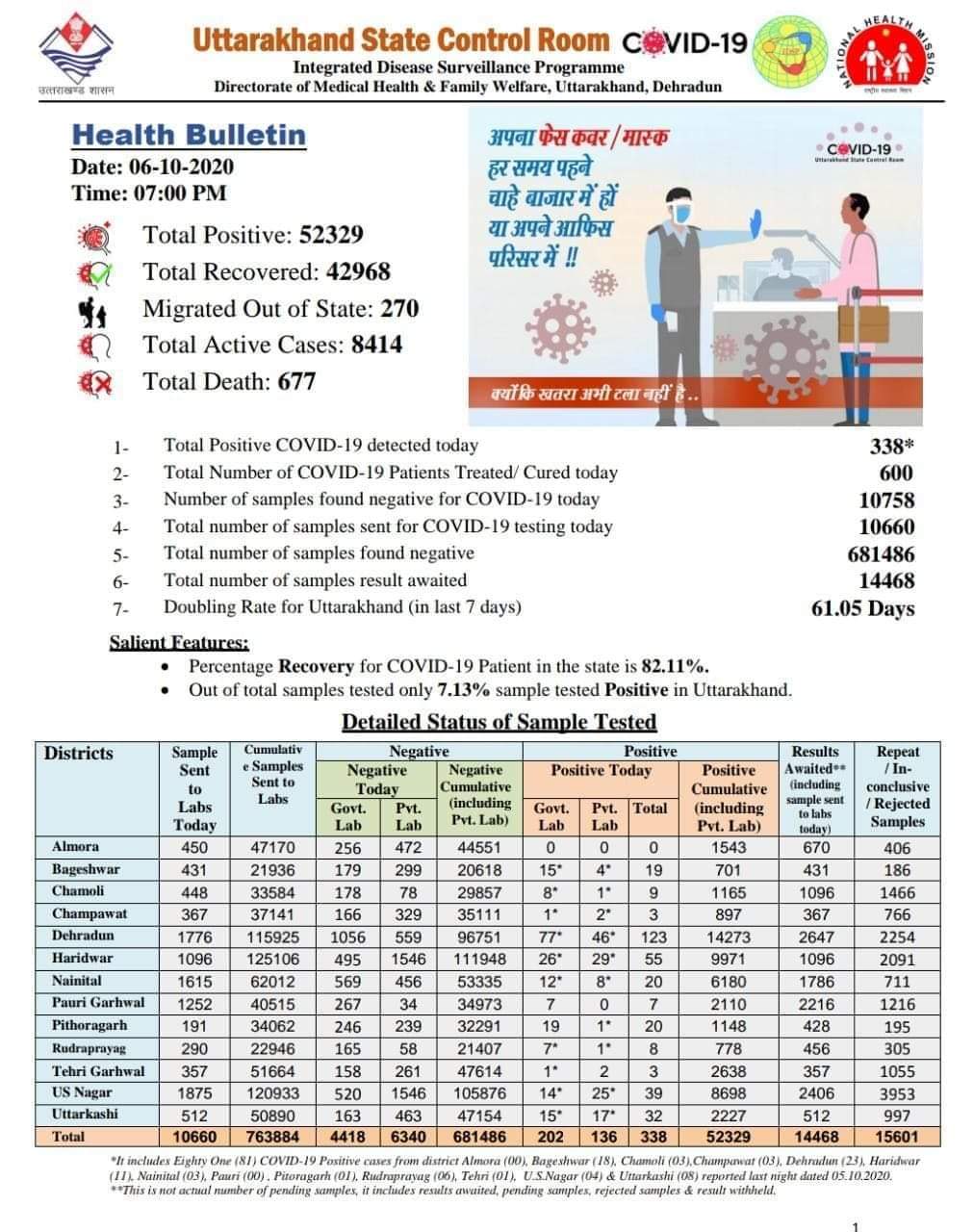 देहरादून | उत्तराखंड में 6 अक्टूबर को हेल्थ रिपोर्ट के अनुसार कोरोना मरीजो की संख्या हुई 52329 आज कुल 338 नए मामले मिले , वही 42968 मरीज हुए है ठीक जब कि इस कोरोना संक्रमण से 677 लोगो की मौत भी हुई है | आज अधिक संख्या में देहरादून में 123, हरिद्वार में 55 नैनीताल में 20 , उधमसिंहनगर में 39 उत्तरकाशी में 32 कोरोना के नए मामले मिले है |