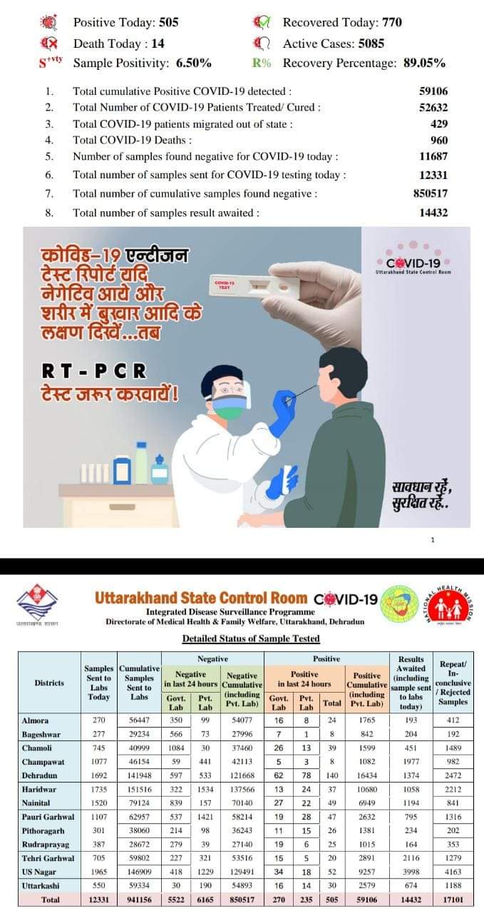 देहरादून | उत्तराखंड में 21 अक्टूबर को हेल्थ रिपोर्ट के अनुसार कोरोना मरीजो की संख्या हुई 59106 आज कुल 505 नए मामले मिले , वही 52632 मरीज हुए है ठीक जब कि इस कोरोना संक्रमण से 960 लोगो की मौत भी हुई है | आज अधिक संख्या में देहरादून में 140 , हरिद्वार 37, अल्मोड़ा में 24, नैनिताल में 49 , चमोली में 39, पौड़ी में 47, पिथौरागढ़ में 26, रुद्रप्रयाग में 25, टिहरी में 20, उत्तरकाशी में 30, उधमसिंहनगर में 52 कोरोना के नए मामले मिले है |