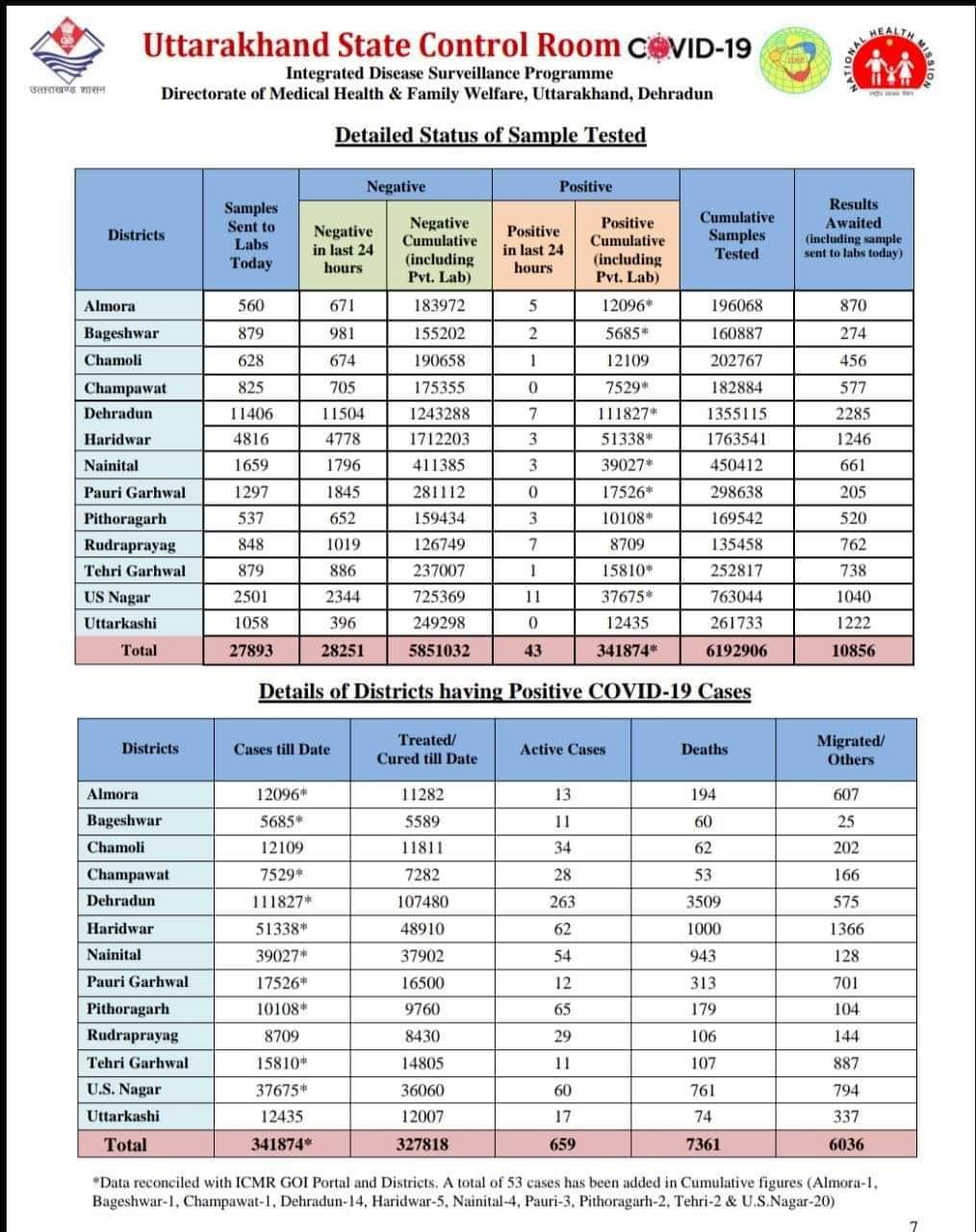 देहरादून | उत्तराखंड में 27 जुलाई 2021 को हेल्थ रिपोर्ट के अनुसार कोरोना मरीजो की संख्या हुई 341874 आज कुल 43 नए मामले मिले, कोरोना संक्रमण से आज प्रदेश में दो की मौत हुई है |