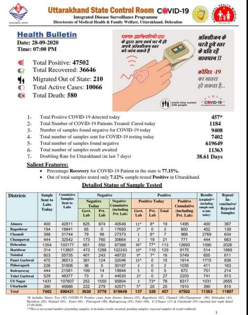 देहरादून | उत्तराखंड में 28 सितम्बर को हेल्थ रिपोर्ट के अनुसार कोरोना मरीजो की संख्या हुई 47502 आज कुल 457 नए मामले मिले , वही 36646 मरीज हुए है ठीक जब कि इस कोरोना संक्रमण से 580 लोगो की मौत भी हुई है | आज अधिक संख्या में देहरादून में 113, हरिद्वार में 129, उधमसिंहनगर में 76, चम्पावत में 21, उत्तरकाशी में 25, टिहरी में 27 कोरोना के नए मामले मिले है |