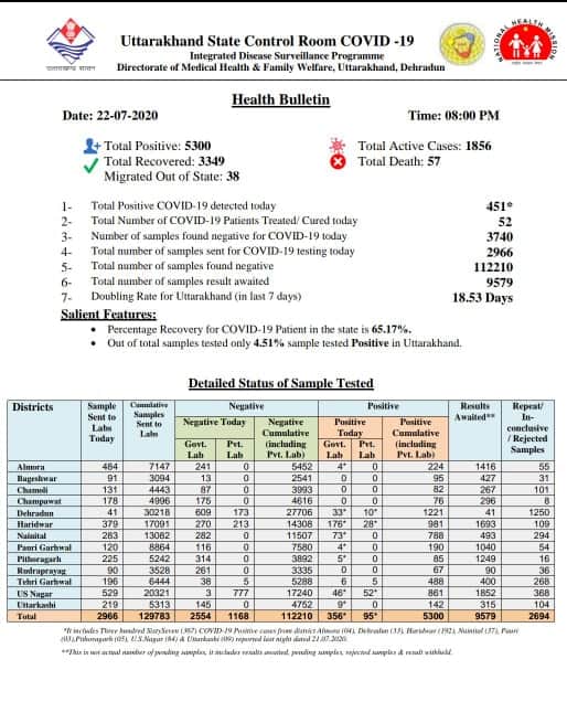 देहरादून | उत्तराखंड में 22 जुलाई को हेल्थ रिपोर्ट के अनुसार कोरोना मरीजो की संख्या हुई 5300, आज कुल 451 नए मामले मिले , वही 3349 मरीज हुए है ठीक जब कि इस कोरोना संक्रमण से 57 लोगो की मौत भी हुई है | आज अधिक संख्या हरिद्वार में 204 , उधमसिंहनगर में 98,  नैनीताल में 73 देहरादून में 43 कोरोना के नए मामले मिले है |