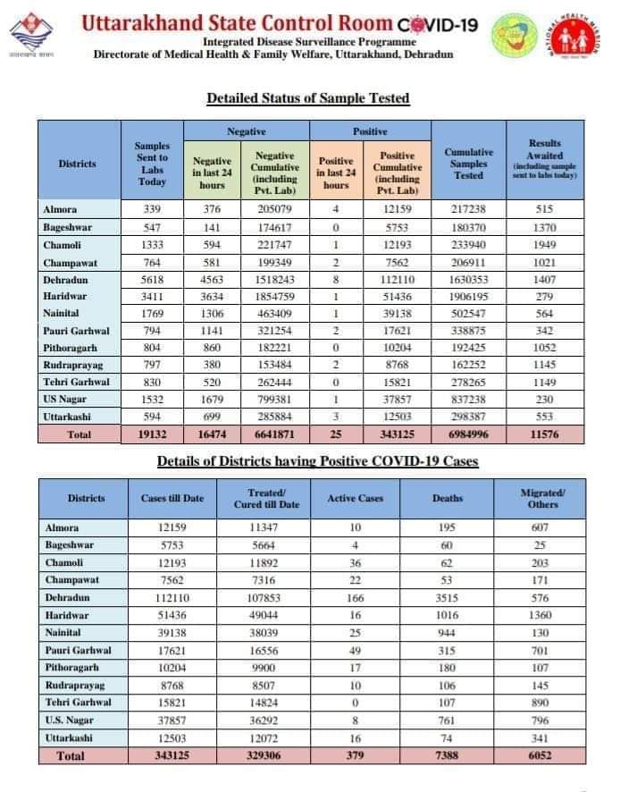 देहरादून | उत्तराखंड में 6 सितम्बर 2021 को हेल्थ रिपोर्ट के अनुसार कोरोना मरीजो की संख्या हुई 343125 , आज कुल 25 नए मामले मिले, कोरोना संक्रमण से आज प्रदेश में कोई भी मौत नही हुई है | आज जहाँ 35 मरीज ठीक हुए वही 25 नये मरीज मिले |