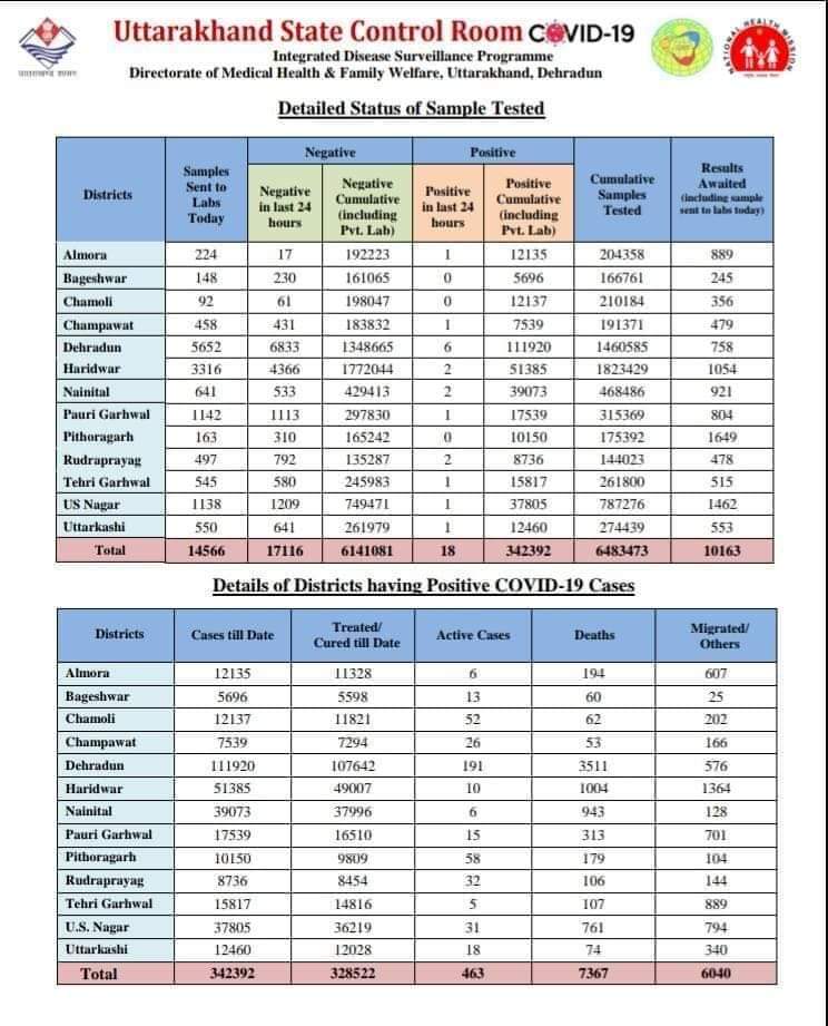 उत्तराखंड : प्रदेश में आज मिले 18 कोरोना मरीज, आज रोजाना से 7 हज़ार कम हुए जाँच, जानिए खबर