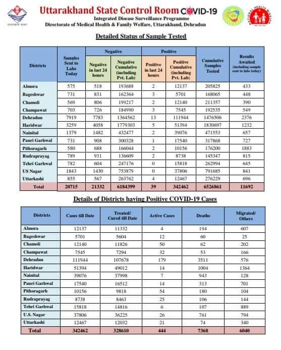 उत्तराखंड : प्रदेश में आज 21 हज़ार से अधिक के जांच में 39 कोरोना मरीज मिले, जानिए खबर
