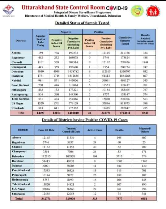 देहरादून | उत्तराखंड में 23 अगस्त 2021 को हेल्थ रिपोर्ट के अनुसार कोरोना मरीजो की संख्या हुई 342771 आज कुल 22 नए मामले मिले, कोरोना संक्रमण से आज प्रदेश में कोई मौत नही हुई है |