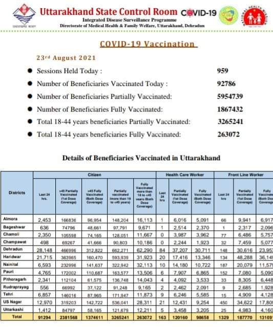 उत्तराखंड : प्रदेश में आज 92 हज़ार से अधिक लोगो को लगा कोरोना टीका , आज मिले कोरोना के 22 नये मामले, जानिए खबर