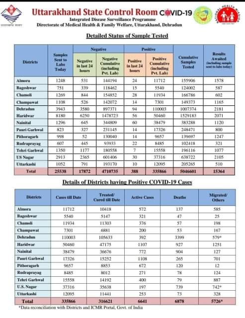 उत्तराखंड : प्रदेश में कोरोना के 335866 मरीजों में सक्रिय मरीज हुए 6641, वही 6878 की हुई मौत, जानिए खबर