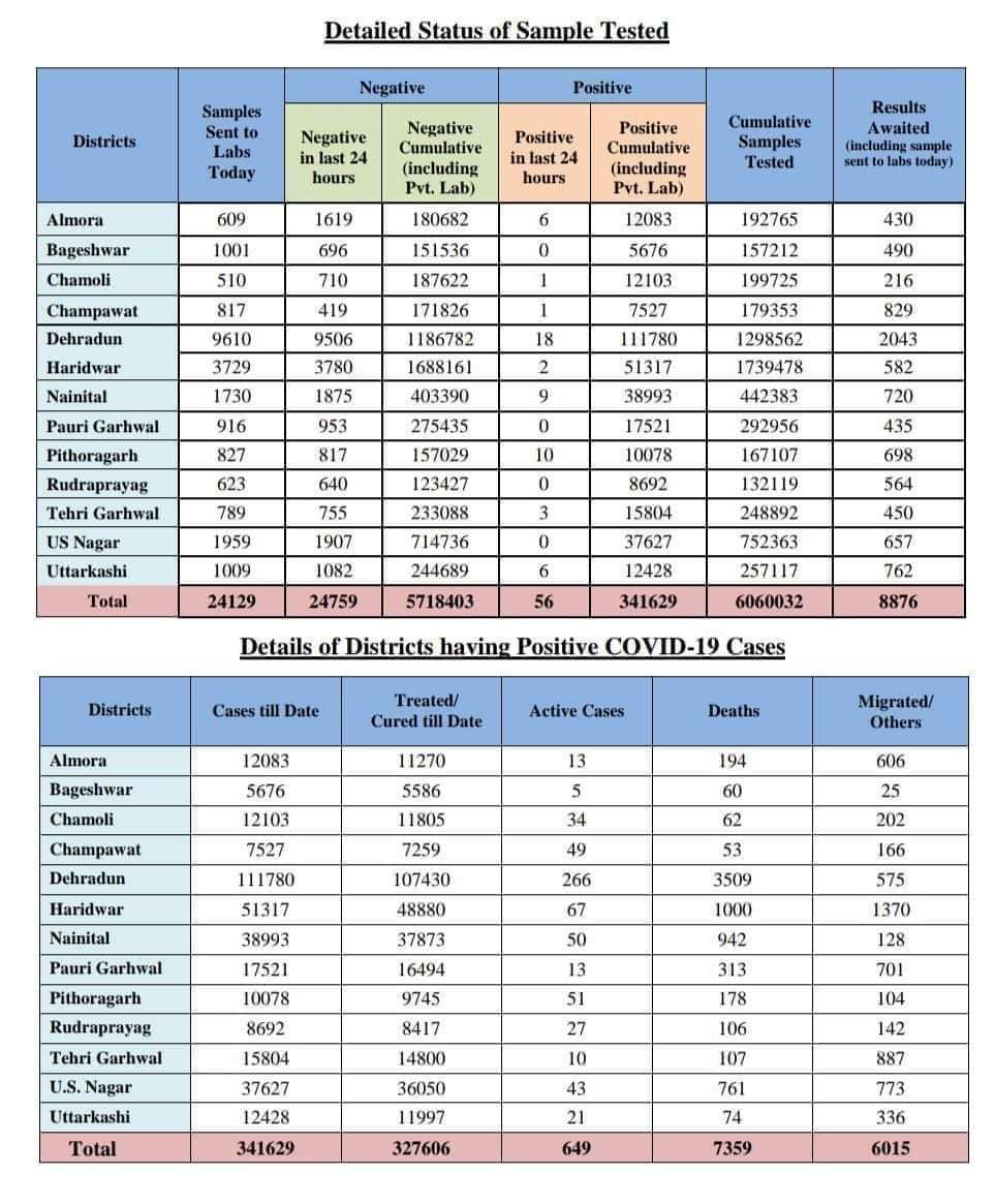 देहरादून | उत्तराखंड में 22 जुलाई 2021 को हेल्थ रिपोर्ट के अनुसार कोरोना मरीजो की संख्या हुई 341629 आज कुल 56 नए मामले मिले, कोरोना संक्रमण से आज प्रदेश में 2 की मौत हुई है |