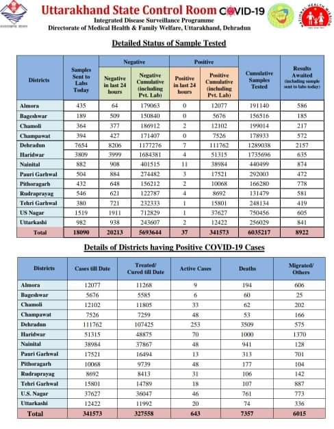 देहरादून | उत्तराखंड में 21 जुलाई 2021 को हेल्थ रिपोर्ट के अनुसार कोरोना मरीजो की संख्या हुई 341537 आज कुल 37 नए मामले मिले, वही कल 50 कोरोना मरीज मिले थे | कोरोना संक्रमण से आज प्रदेश में कोई मौत नही हुई है |