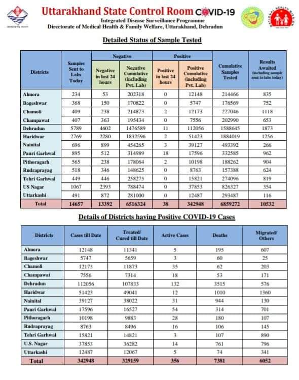 देहरादून | उत्तराखंड में 30 अगस्त 2021 को हेल्थ रिपोर्ट के अनुसार कोरोना मरीजो की संख्या हुई 342948 आज कुल 38 नए मामले मिले, कोरोना संक्रमण से आज प्रदेश में एक कि मौत हुई है | आज जहाँ 16 मरीज ठीक हुए वही 38 नये मरीज मिले |