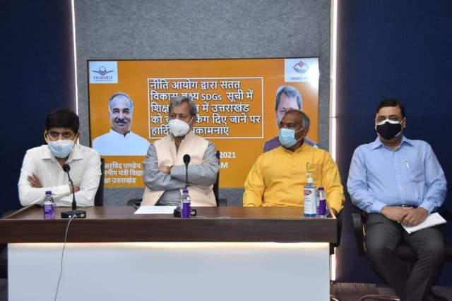 देहरादून | मुख्यमंत्री तीरथ सिंह रावत ने राजीव गाँधी नवोदय विद्यालय, तपोवन रायपुर, देहरादून से प्रदेश के शिक्षकों से वर्चुअल संवाद किया। मुख्यमंत्री ने नीति आयोग द्वारा जारी सतत विकास लक्ष्य SDGs सूची में शिक्षा के क्षेत्र में उत्तराखण्ड को चौथी रैंकिंग प्राप्त होने पर शिक्षा विभाग के अधिकारियों एवं सभी शिक्षक-शिक्षिकाओं को बधाई दी। इस वर्चुअल संवाद में 500 स्कूलों से शिक्षक जुड़े थे। इस अवसर पर मुख्यमंत्री ने अटल उत्कृष्ट विद्यालय की वेबसाइट लाँच की। मुख्यमंत्री तीरथ सिंह रावत ने कहा कि यह प्रदेश के लिए सौभाग्य की बात है कि नीति आयोग द्वारा जारी सतत विकास लक्ष्य SDGs सूची में चौथा स्थान प्राप्त हुआ है। 17 विभिन्न आयामों को लेकर सूची का निर्धारण किया गया। 2015-16 में जहां राज्य को 19वां स्थान मिला था, आज राज्य ने चौथा स्थान प्राप्त किया। उन्होंने कहा कि आने वाले समय में शिक्षा के क्षेत्र में उत्तराखण्ड को प्रथम स्थान पर लाने के लिए शिक्षा विभाग के अधिकारियों एवं शिक्षकों को इसी मनोयोग से कार्य करना होगा। मुख्यमंत्री ने कहा कि कोविड काल में पठन-पाठन का कार्य एक नई चुनौती है। सीमित संसाधन होने के बावजूद भी ऑनलाईन शैक्षणिक गतिविधियों के लिए शिक्षा विभाग द्वारा सराहनीय प्रयास किया गया। मुख्यमंत्री तीरथ सिंह रावत ने कहा कि स्कूलों की व्यवस्थाओं में गुणात्मक सुधार लाने के लिए राज्य सरकार द्वारा हर संभव प्रयास किये जा रहे हैं। स्कूलों में विभिन्न व्यवस्थाओं के लिए जिला प्लान के माध्यम से व्यवस्थाएं की गई हैं। उन्होंने कहा कि प्रदेश के दूरस्थ क्षेत्रों तक नेट कनेक्टिविटी को बढ़ावा देने के लिए लगातार प्रयास किये जा रहे हैं। अटल उत्कृष्ट विद्यालयों के माध्यम से शिक्षा के स्तर में और सुधार करने के लिए प्रयास किये जा रहे हैं। राज्य में 190 अटल उत्कृष्ट विद्यालय स्वीकृत किये गये हैं। इस अवसर पर मुख्यमंत्री ने अनेक स्कूलों के शिक्षकों के साथ वर्चुअल संवाद किया। शिक्षा मंत्री अरविन्द पाण्डेय ने शिक्षा के क्षेत्र में उत्तराखण्ड की चौथी रैंकिंग प्राप्त होने पर शिक्षा विभाग के अधिकारियों एवं शिक्षकों को बधाई दी। उन्होंने कहा कि उत्तराखण्ड की देवभूमि के रूप में विश्व में अलग पहचान है। शिक्षकों के कठिन परिश्रम के परिणामस्वरूप उत्तराखण्ड ने नीति आयोग द्वारा जारी सतत विकास लक्ष्य SDGs सूची में चौथा स्थान प्राप्त किया है। उन्होंने कहा कि शिक्षा के क्षेत्र में गुणात्मक सुधार के लिए राज्य सरकार द्वारा लगातार प्रयास किये जा रहे हैं। प्रदेश में सभी के लिए एक जैसा पाठ्यक्रम लागू किया गया है। 90 प्रतिशत स्कूलों में फर्नीचर की व्यवस्था है। इसे जल्द ही शत प्रतिशत किया जायेगा। 500 स्कूलों में वर