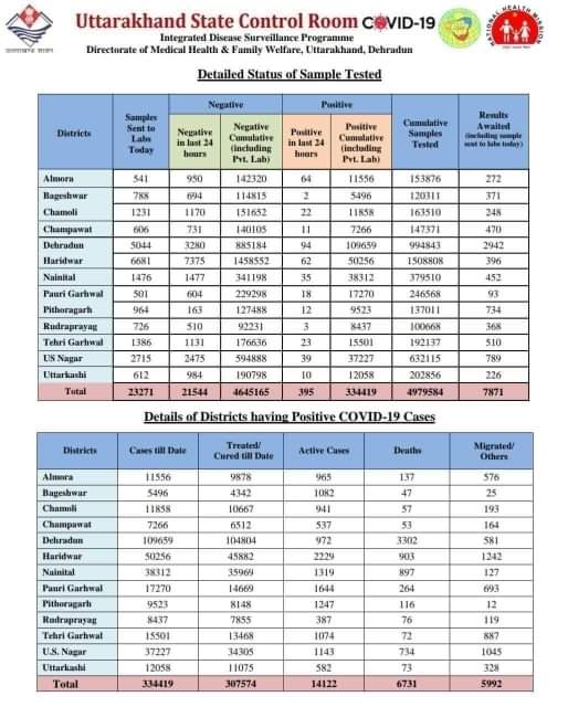 देहरादून | उत्तराखंड में 07 जून 2021 को हेल्थ रिपोर्ट के अनुसार कोरोना मरीजो की संख्या हुई 334419 आज कुल 395 नए मामले मिले, इस कोरोना संक्रमण से आज 21 लोगो की मौत हुई है |