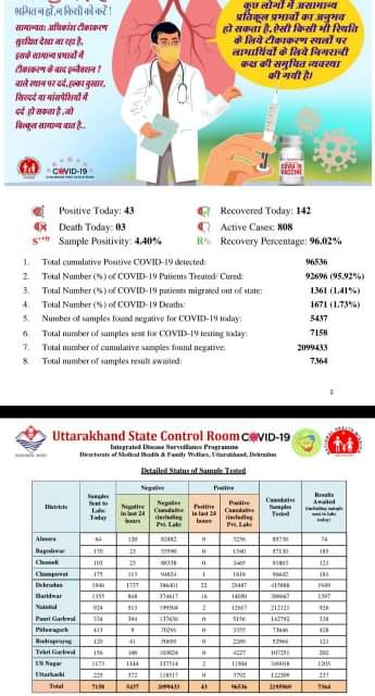 उत्तराखंड 08 फरवरी : देहरादून में अब सौ से कम है सक्रिय कोरोना मरीज, आज प्रदेश में 43 मरीज मिले, जानिए खबर