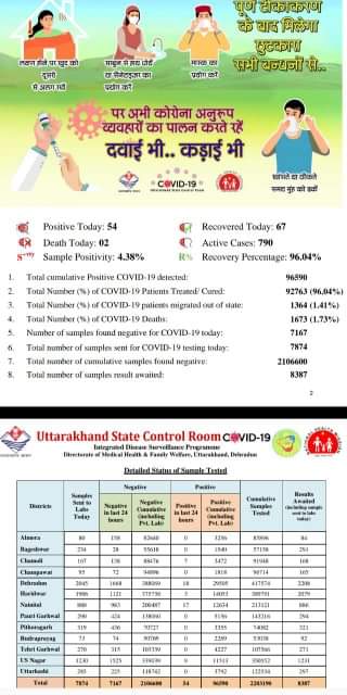 देहरादून | उत्तराखंड में 09 फरवरी को हेल्थ रिपोर्ट के अनुसार कोरोना मरीजो की संख्या हुई 96590,  आज कुल 54 नए मामले मिले , वही 92763 मरीज हुए है ठीक जब कि इस कोरोना संक्रमण से 1673 लोगो की मौत भी हुई है आज प्रदेश में दो की मौत हुई है | आज अधिक संख्या में देहरादून में 18, नैनीताल में 17, चमोली में 7 और उधमसिंहनगर में 09 कोरोना के नए मामले मिले है | वही आज प्रदेश में 6075 लोगो को कोरोना टीका लगाया गया |