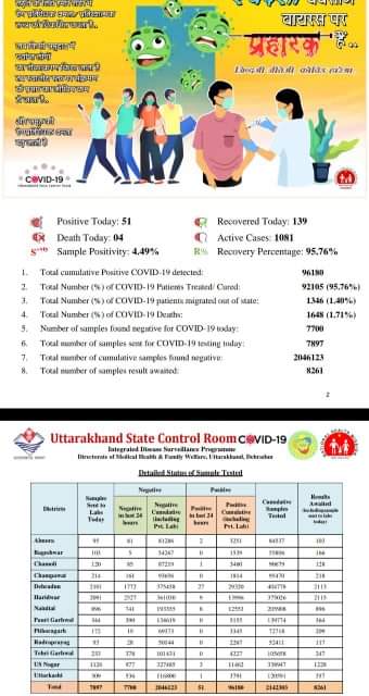देहरादून | उत्तराखंड में 01 फरवरी को हेल्थ रिपोर्ट के अनुसार कोरोना मरीजो की संख्या हुई 96180, आज कुल 51 नए मामले मिले , वही 92105 मरीज हुए है ठीक जब कि इस कोरोना संक्रमण से 1648 लोगो की मौत भी हुई है आज प्रदेश में चार की मौत हुई है | आज अधिक संख्या में देहरादून में 27, हरिद्वार में 09, नैनीताल में 08 कोरोना के नए मामले मिले है | वही प्रदेश में आज 6077 लोगो को कोरोना टीका लगा है |
