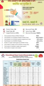 आज कुल 116 नए मामले मिले , वही 90133 मरीज हुए है ठीक जब कि इस कोरोना संक्रमण से 1619 लोगो की मौत भी हुई है आज प्रदेश में 02 लोगो की मौत हुई | आज अधिक संख्या में देहरादून में 55, नैनीताल में 28, अल्मोड़ा में 11 कोरोना के नए मामले मिले है |