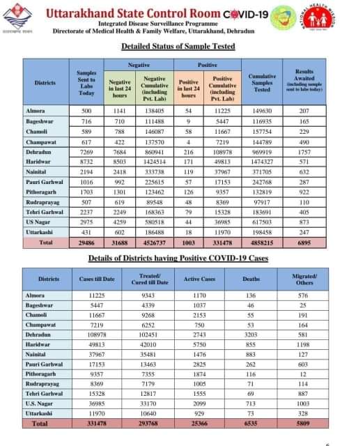 उत्तराखंड 2 जून 2021 : प्रदेश में आज 1003 मिले कोरोना मरीज, आज इन जिलों में मिले अधिक मरीज, जानिए खबर