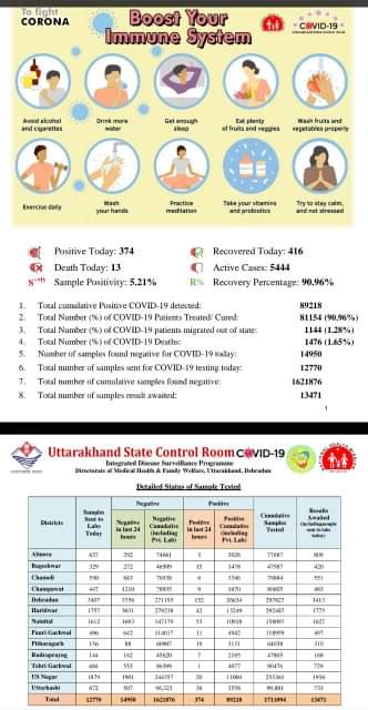 आज कुल 374 नए मामले मिले , वही 81154 मरीज हुए है ठीक जब कि इस कोरोना संक्रमण से 1476 लोगो की मौत भी हुई है आज प्रदेश में 13 लोगो की मौत हुई | आज अधिक संख्या में देहरादून में 152, नैनीताल में 53, हरिद्वार में 42, पिथौरागढ़ में 19, पौड़ी में 21, उधमसिंहनगर में 20, उत्तरकाशी में 36 , बागेश्वर में 15 कोरोना के नए मामले मिले है |