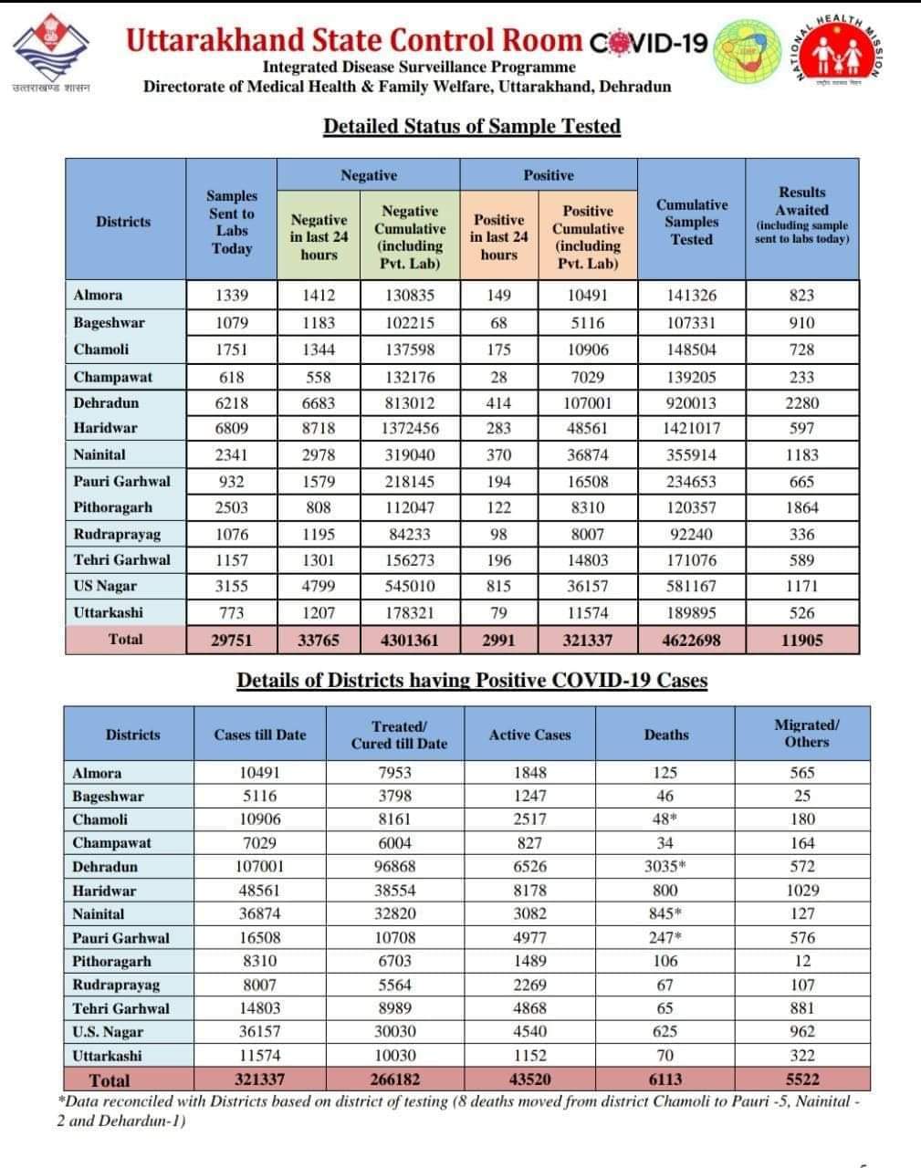 देहरादून | उत्तराखंड में 26 मई 2021 को हेल्थ रिपोर्ट के अनुसार कोरोना मरीजो की संख्या हुई 321337 आज कुल 2991 नए मामले मिले, इस कोरोना संक्रमण से आज 53 लोगो की मौत हुई है |
