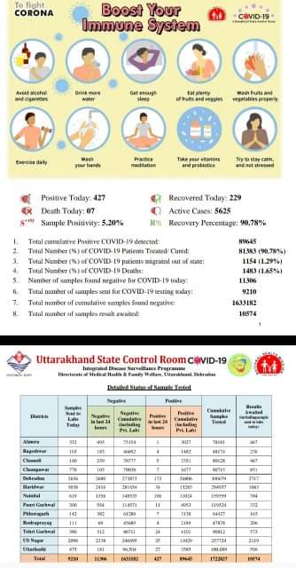 आज कुल 427 नए मामले मिले , वही 81383 मरीज हुए है ठीक जब कि इस कोरोना संक्रमण से 1483 लोगो की मौत भी हुई है आज प्रदेश में 07 लोगो की मौत हुई | आज अधिक संख्या में देहरादून में 172, नैनीताल में 106, हरिद्वार में 34, उधमसिंहनगर में 25, टिहरी में 24 , उत्तरकाशी में 27 कोरोना के नए मामले मिले है |