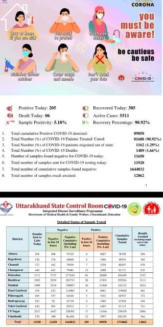 आज कुल 205 नए मामले मिले , वही 81688 मरीज हुए है ठीक जब कि इस कोरोना संक्रमण से 1489 लोगो की मौत भी हुई है आज प्रदेश में 06 लोगो की मौत हुई | आज अधिक संख्या में देहरादून में 83, नैनीताल में 36, हरिद्वार में 20, उधमसिंहनगर में 17 कोरोना के नए मामले मिले है |