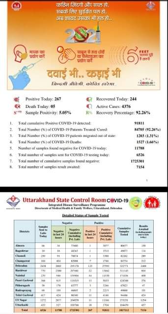 उत्तराखंड 3 जनवरी : प्रदेश में आज कोरोना के 267 मरीज मिले, आज 5 की हुई मौत
