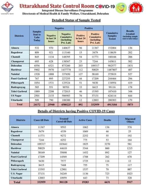 देहरादून | उत्तराखंड में 04 जून 2021 को हेल्थ रिपोर्ट के अनुसार कोरोना मरीजो की संख्या हुई 332959 आज कुल 892 नए मामले मिले, इस कोरोना संक्रमण से आज 43 लोगो की मौत हुई है |