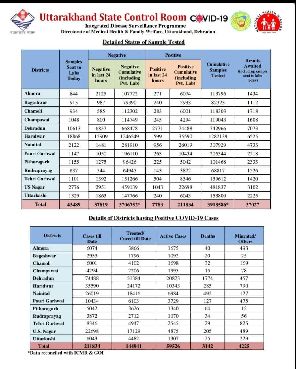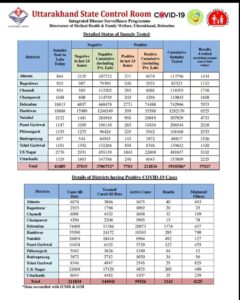 देहरादून | उत्तराखंड में 5 मई 2021 को हेल्थ रिपोर्ट के अनुसार कोरोना मरीजो की संख्या हुई 211834 आज कुल 7783 नए मामले मिले, इस कोरोना संक्रमण से आज 127 लोगो की मौत भी हुई है | आज प्रदेश में 42268 लोगों को लगा कोरोना टीका |
