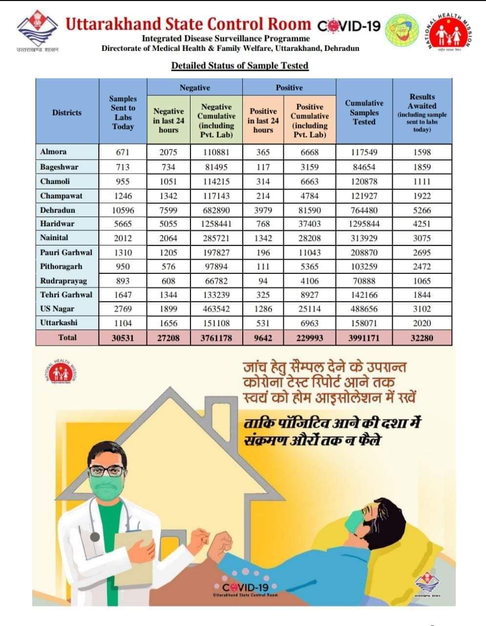देहरादून | उत्तराखंड में 7 मई 2021 को हेल्थ रिपोर्ट के अनुसार कोरोना मरीजो की संख्या हुई 229993 आज कुल 9642 नए मामले मिले, इस कोरोना संक्रमण से आज 137 लोगो की मौत भी हुई है | आज प्रदेश में 35771 लोगों को लगा कोरोना टीका |