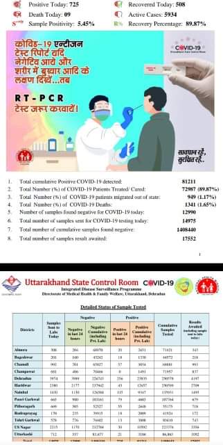 आज कुल 725 नए मामले मिले , वही 72987 मरीज हुए है ठीक जब कि इस कोरोना संक्रमण से 1341 लोगो की मौत भी हुई है आज प्रदेश में 09 लोगो की मौत हुई | आज अधिक संख्या में देहरादून में 256, हरिद्वार में 43, नैनीताल में 115, पौड़ी में 79, पिथौरागढ़ में 55, अल्मोड़ा में 20 चमोली में 57, उधमसिंहनगर में 30, , उत्तरकाशी में 21 कोरोना के नए मामले मिले है |