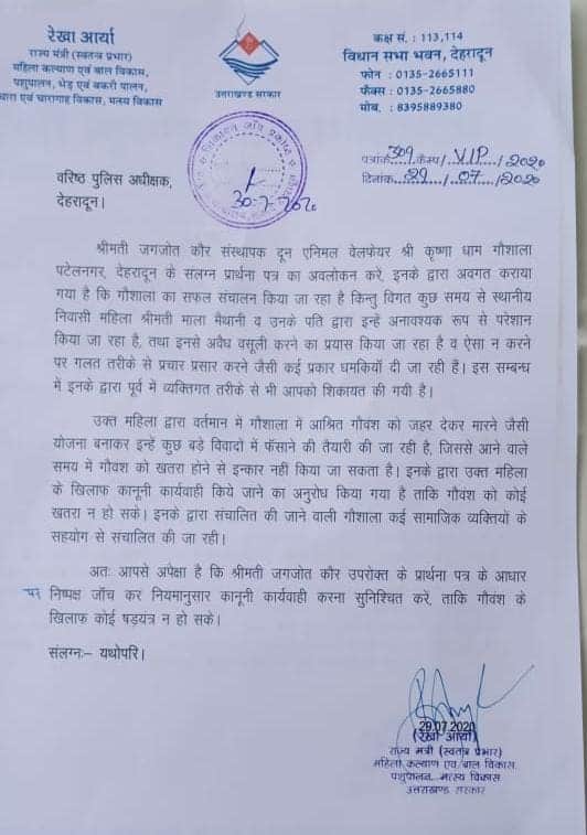 पशुपालन मंत्री रेखा आर्य ने एक पत्र को एसएसपी के नाम लिखते हुए बताया कि दून पशुपालन मंत्री ने एनिमल वेलफेयर एवं कृष्णा धाम गौशाला पर एक महिला व उसके पति ने षडयंत्र रच कर अवैध वसूली को लेकर गौशाला संचालकों पर पर दबाव बनाने का काम किया है। जो समाज एवं गौ माताओं की जिंदगी के लिए खिलवाड़ साबित हो रहा है।