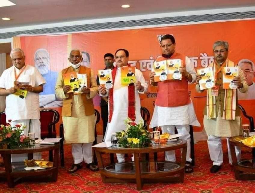 देहरादून | भाजपा के राष्ट्रीय अध्यक्ष जगत प्रकाश नड्डा एवं मुख्यमंत्री पुष्कर सिंह धामी ने हरिद्वार के एक स्थानीय होटल में उत्तराखंड के विकास पर आधारित पुस्तक “उत्तराखंड विकास के स्वर्णिम पथ पर” एवं ” युवा प्रदेश युवा नेतृत्व विकल्प रहित संकल्प” पत्रिका का विमोचन किया। उत्तराखंड सरकार की जन कल्याणकारी योजनाओं, सरकार द्वारा लिए गए महत्वपूर्ण निर्णयों एवं केन्द्र सरकार के सहयोग से उत्तराखंड में हो रहे कार्यों की जानकारी “उत्तराखंड विकास के स्वर्णिम पथ पर” पत्रिका में दी गई है। “युवा प्रदेश युवा नेतृत्व विकल्प रहित संकल्प” पत्रिका में मुख्यमंत्री पुष्कर सिंह धामी के नेतृत्व में केबिनेट में लिए गए महत्वपूर्ण निर्णयों, कोविड 19 में प्रभावितों को राज्य सरकार द्वारा दिए जा रहे राहत पैकेज, मुख्यमंत्री पुष्कर सिंह धामी द्वारा जनहित में की गई घोषणाओं एवं राज्य के विकास के लिए रोडमैप की जानकारी दी गई है।