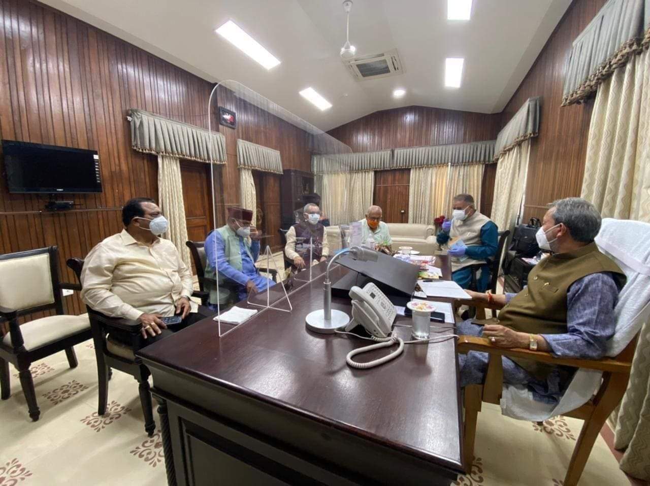 देहरादून। मुख्यमंत्री तीरथ सिंह रावत ने शुक्रवार को मुख्यमंत्री कैंप कार्यालय में देहरादून के सभी विधायक गणों के साथ कोविड-19 की रोकथाम के संबंध में महत्वपूर्ण बैठक ली। इस दौरान मुख्यमंत्री तीरथ सिंह रावत ने कहा कि संकट के इस दौर में सभी विधायक गण, जनप्रतिनिधि जनता के साथ निरंतर संवाद बनाए रखें। मुख्यमंत्री ने कहा कि जनप्रतिनिधि आम जनता को कोविड वैक्सीनेशन के लिए अधिक से अधिक प्रेरित करें। इसके साथ ही मुख्यमंत्री तीरथ सिंह रावत ने बताया कि अधिकारियों को निर्देश दिए हैं कि वे जनप्रतिनिधियों के समन्वय बनाते हुए कोरोना के खिलाफ इस जंग को मजबूती से लड़ने में सहयोग लें। मुख्यमंत्री कैंप कार्यालय में आयोजित इस बैठक में कैबिनेट मंत्री गणेश जोशी, कैंट विधायक हरबंस कपूर, राजपुर विधायक खजान दास, धर्मपुर विधायक विनोद चमोली के अलावा देहरादून में महापौर सुनील उनियाल गामा मौजूद रहे।