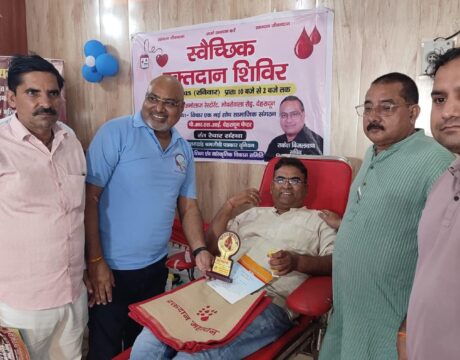 100वीं बार रक्तदान करने वाले राकेश रंजन उर्फ चुन्ना यादव हुए सम्मानित