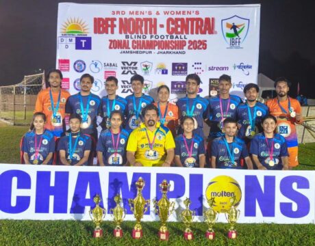 देहरादून | दोनों ही टीमों ने आईं बी एफ एफ नॉर्थ सेंट्रल जोन ब्लाइंड फुटबॉल टूर्नामेंट जीते।झारखंड के जमशेदपुर शहर में 1 से 3 नवंबर 2025 तक चली प्रतियोगिता में दोनों ही टीमों ने खिताब अपने नाम किए।महिला टीम की कप्तान शेफाली रावत ने टीम को जीत दिलाने किले साथ साथ दो ट्रॉफीज भी अपने नाम की।शेफाली ने कुल 21 गोल कर के गोल्डन बूट जीता और साथ ही प्लेयर ऑफ द टूर्नामेंट का खिताब भी जीता।साथ ही महिला टीम में स्मिता रावत ने बेस्ट गोलकीपर का अवॉर्ड जीता।उनका यह पहला टूर्नामेंट भी था।पुरुष टीम की कप्तानी शिवम् सिंह नेगी…