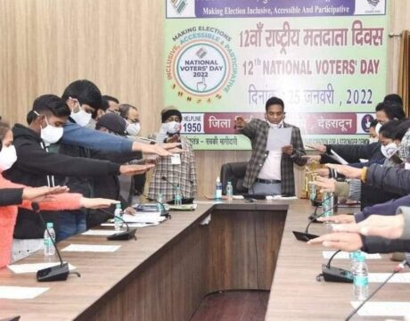 देहरादून। राष्ट्रीय मतदाता दिवस के अवसर पर ऋषिपर्णा सभागार कलेक्ट्रेट में आयोजित कार्यक्रम में जिला निर्वाचन अधिकारी व जिलाधिकारी डॉ0 आर राजेश कुमार ने मतदाता जागरूकता हेतु बनाये गये गीत ‘‘एक उंगली में कितना दम, वोट करें देखें हम’’ लांच किया गया। इस दौरान प्रथम बार मतदाता बने युवक/युवतियों को फोटो पहचान पत्र वितरित करने के साथ ही मतदाता जागरूकता कार्यक्रम में भूमिका निभाने वाले नव युवक/युवतियों को पुरस्कृत किया गया। इस दौरान कार्यक्रम में उपस्थित युवक/युवतियों, कैम्पस एम्बेसडर एवं कार्मिकों को मतदाता शपथ दिलाई गई।