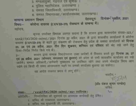उत्तराखंड : अब सरकारी कार्यालय बुधवार तक रहेंगे बन्द , आदेश जारी
