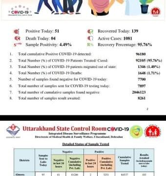 उत्तराखंड 1 फरवरी : प्रदेश के छह जिलो में आज एक भी कोरोना मरीज नही मिले, आज देहरादून में मिले 27 , जानिए खबर