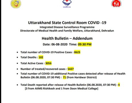 देहरादून | आज रात्रि 9: 30 बजे पुनः राज्य हेल्थ रिपोर्ट के अनुसार 71 और कोरोना मरीज मिले , आज कुल 369 नए कोरोना मरीज मिले , 71 और कोरोना मरीज हरिद्वार से मिले है , उत्तराखंड में कोरोना मरीजो की संख्या हुई 8623, उत्तराखंड में कोरोना से मरने वालों की संख्या सौ के पार पहुँच चुकी है