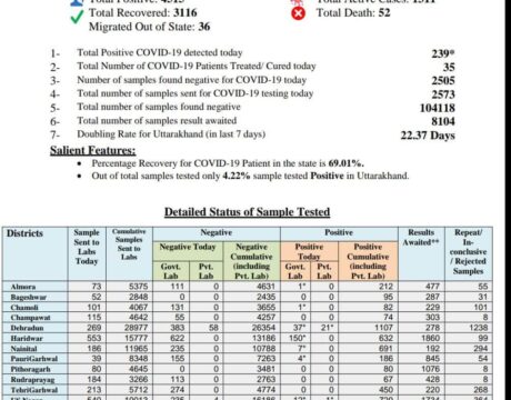 कोरोना से बचे : उत्तराखंड में कोरोना मरीजो की संख्या हुई 4515, आज कुल 239 नए मरीज मिले