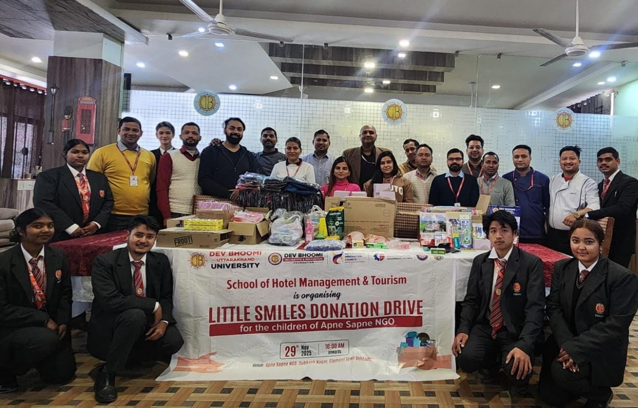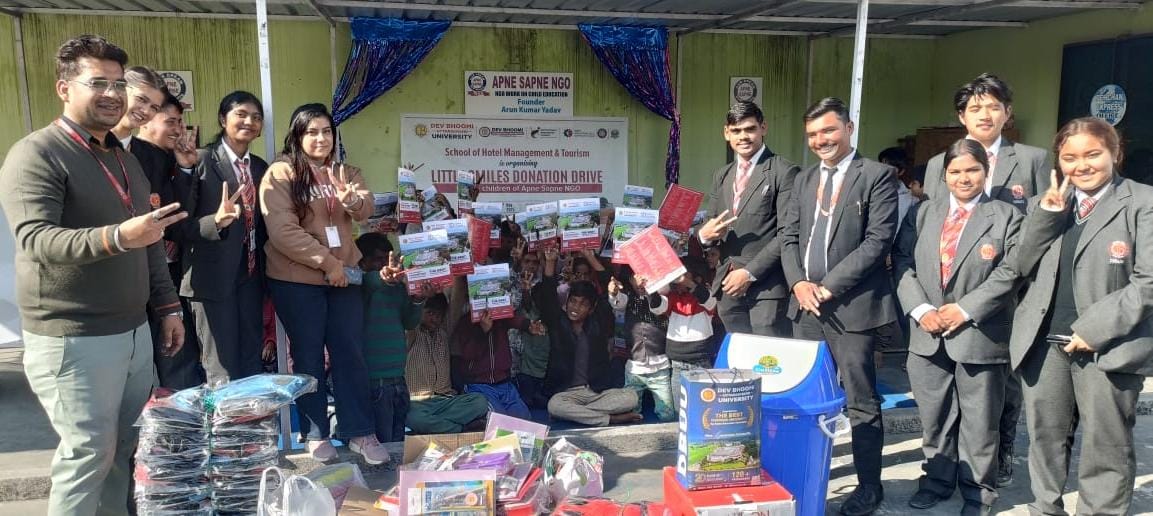 देहरादून | अपने सपने एनजीओ सुभाषनगर स्थित संस्था प्रांगण में जरूरतमंद बच्चों के लिए “लिटिल स्माइल” नामक कार्यक्रम का आयोजन देवभूमि उत्तराखंड यूनिवर्सिटी के स्कूल ऑफ़ होटल मैनेजमेंट विभाग द्वारा किया गया | इस अवसर पर स्कूल ऑफ़ होटल मैनेजमेंट विभाग के छात्र छात्राओं द्वारा अपने सपने एनजीओ के बच्चों से रूबरू हुए वही बच्चों के साथ खेल- कूद , गीत-संगीत एवम् जीवन में शिक्षा के महत्त्व को लेकर जानकारियां दी गयी |