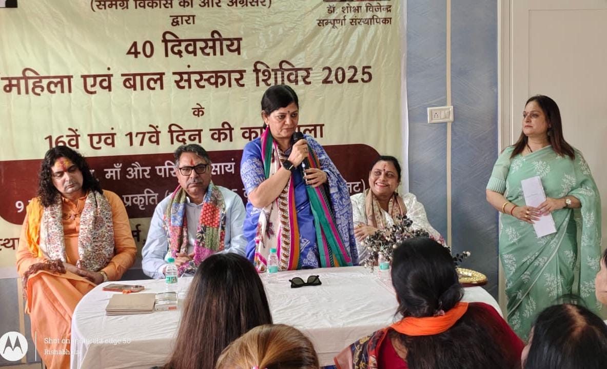 नई दिल्ली / जयपुर | 1993 में स्थापित, सम्पूर्णा दिल्ली में स्थित एक ऐसा गैर-सरकारी संगठन है जो महिलाओं और बच्चों को सशक्त बनाने के मिशन के साथ काम कर रहा है। इसकी संस्थापिका डॉ. शोभा विजेन्द्र तीन दशकों से भी अधिक समय से महिलाओं के अधिकारों के लिए लड़ रही सामाजिक कार्यकर्ता हैं। गर्मियों की छुट्टियों में आयोजित 40 दिवसीय ‘महिला एवं बाल संस्कार शिविर’ उनके द्वारा चलाए जा रहे कार्यक्रमों का ही एक हिस्सा है। इस शिविर में प्रतिभागियों को प्रार्थना, मंत्रोच्चारण, वैदिक श्लोक, शिष्टाचार तथा सामाजिक-सांस्कृतिक गतिविधियों के माध्यम से नैतिक एवं आध्यात्मिक विकास की दिशा में मार्गदर्शन दिया जाता है। सेल्फ डिफेंस सिखाया जाता है और विभिन्न सृजनात्मक गतिविधियों द्वारा उन्हें रचनात्मक रूप से सक्षम बनाया जाता है। 40 दिन के शिविर का सोलहवां व सत्रहवां दिन जयपुर में स्थित सोहम फार्म में संपन्न हुआ। पहले सत्र का विषय था-‘मां और प्रकृति के सान्निध्य में संस्कारों की यात्रा।’ कार्यक्रम का शुभारंभ दीप प्रज्वलन से हुआ, जिसमें राष्ट्रीय प्रभारी, हरियाणा, सतीश पूनिया, विधायक एवं आध्यात्मिक संत स्वामी बालमुकुंदाचार्य, राष्ट्रीय महिला मोर्चा उपाध्यक्ष पूजा कपिल मिश्रा तथा संस्थापिका डॉ. शोभा विजेन्द्र की गरिमामयी उपस्थिति रही। डॉ. शोभा विजेन्द्र, संस्थापिका सम्पूर्णा ने अपने विचार रखते हुए सनातन और पाश्चात्य संस्कृतियों के मूलभूत अंतर को स्पष्ट किया। उन्होंने बताया कि पाश्चात्य संस्कृति व्यक्ति को केंद्र में रखती है, जबकि सनातन संस्कृति परिवार, समाज और प्रकृति के सामूहिक उत्थान की बात करती है। उन्होंने कहा कि पहले हमारी मुख्य केंद्रबिंदु महिला थी, फिर समझ आया कि हम उसकी स्थिति में चाहे कितना ही सुधार क्यों न कर लें, जब तक कि उसका परिवार उसके साथ नहीं होगा, उसके विकसित होने से कोई सुधार न होगा। तब हमने महिला को केंद्र में रखकर परिवार को बेहतर बनाने की दिशा में काम करना शुरू किया।’ स्वामी श्री बालमुकुंदाचार्य जी ने कहा कि “गृहिणी के बिना कोई भी घर पूर्ण नहीं होता।” उन्होंने महिलाओं को समाज और राष्ट्र निर्माण की आधारशिला बताया और वर्तमान समय में सोशल मीडिया के दुष्प्रभावों से सचेत रहने की सलाह दी। सतीश पूनिया जी ने केंद्र सरकार द्वारा चलाई जा रही महिला सशक्तिकरण योजनाओं की जानकारी दी और कहा कि पहले जहां बेटियों को जन्म से पहले ही रोक दिया जाता था, आज वही बेटियां राष्ट्र की शक्ति और सम्मान बन रही हैं। राष्ट्रीय महिला मोर्चा उपाध्यक्ष पूजा कपिल मिश्रा ने कहा कि मां ही सम्पूर्ण सृष्टि का मूल है। 9 जून को 17वें सत्र में ‘जल संरक्षण और प्रकृति’ पर विशेष परिचर्चा का आयोजन किया गया जिसमें पर