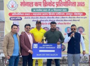 देहरादून | मोनाल कप 2025 में दिनांक 12.12.2025 को महाराणा प्रताप क्रिकेट ग्राउंड में आज के दिन का पहला सेमीफाइनल मैच सचिवालय ए और सचिवालय डेंजर के बीच खेला गया। डेंजर की टीम ने पहले खेलते हुए कुल 20 ओवरों में 07 विकेट पर 135 रन बनाए। नूर ने 34 और मनोज बिष्ट ने 29 रन बनाए। आशुतोष विमल ने 03 विकेट लिए। लक्ष्य का पीछा करने उतरी सचिवालय ए की टीम ने 17.3 ओवरों में 05 विकेट खोकर लक्ष्य प्राप्त कर लिया। हरीश सैनी और राहुल जेटली ने 37-37 रन बनाए। अमित तोमर ने 02 विकेट लिए। इस तरह सचिवालय ए ने मैच 05 विकेट से जीत लिया। आशुतोष विमल को मैन ऑफ द मैच दिया गया।